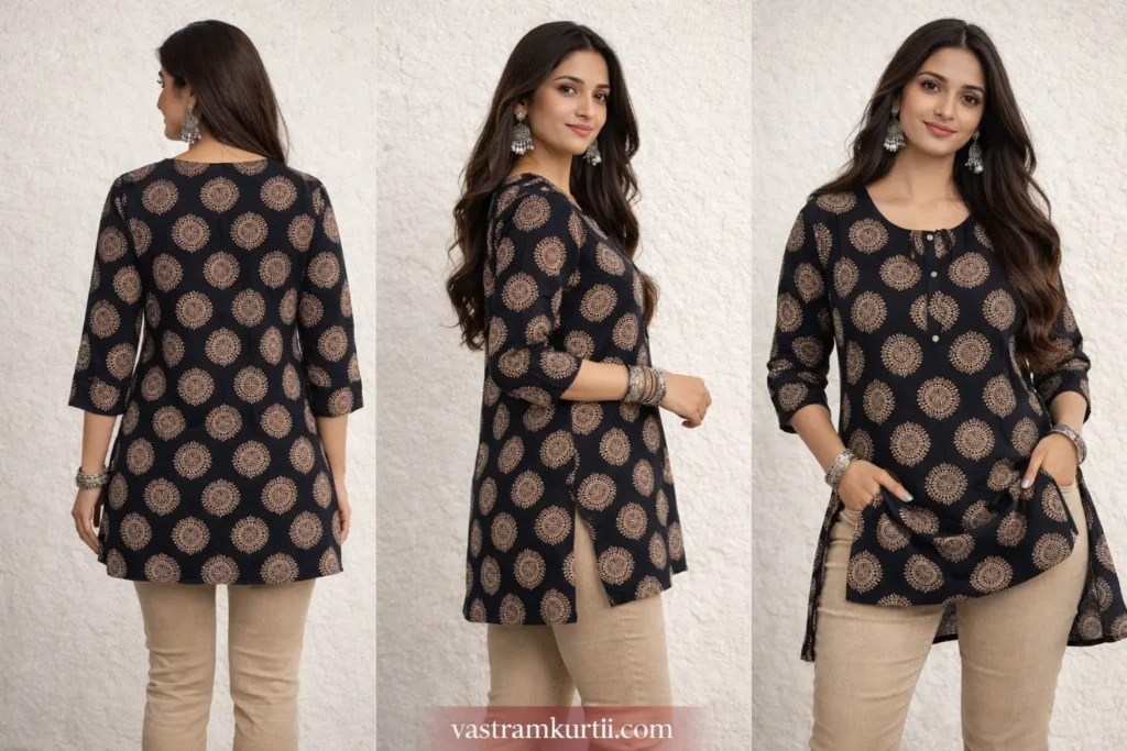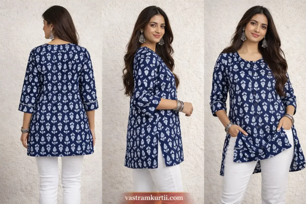 Premium short kurtis by Vastramkurtii are incredibly versatile. They are ideal for office wear when paired with straight pants or palazzos and work equally well for casual outings for travel. Their modern length and elegant design make them perfect for fusion styling.