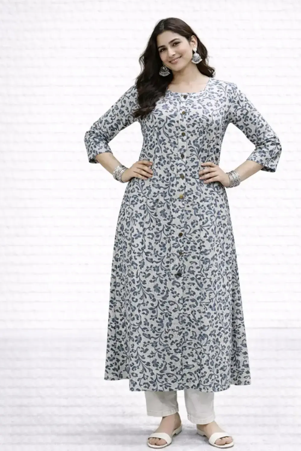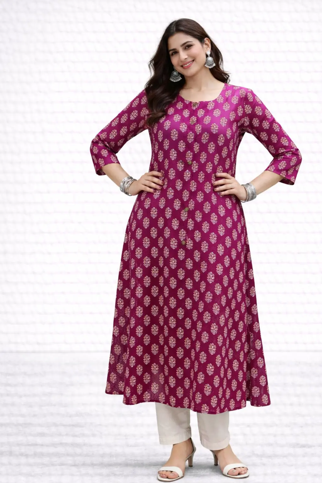 Designed with a round neckline, this kurti offers a clean and graceful look. The front button placket enhances the overall design while remaining non-functional and purely decorative, ensuring a smooth and comfortable fit. The 3/4th sleeves provide ease of movement and make the kurti suitable for workwear, daily outings, or relaxed gatherings.